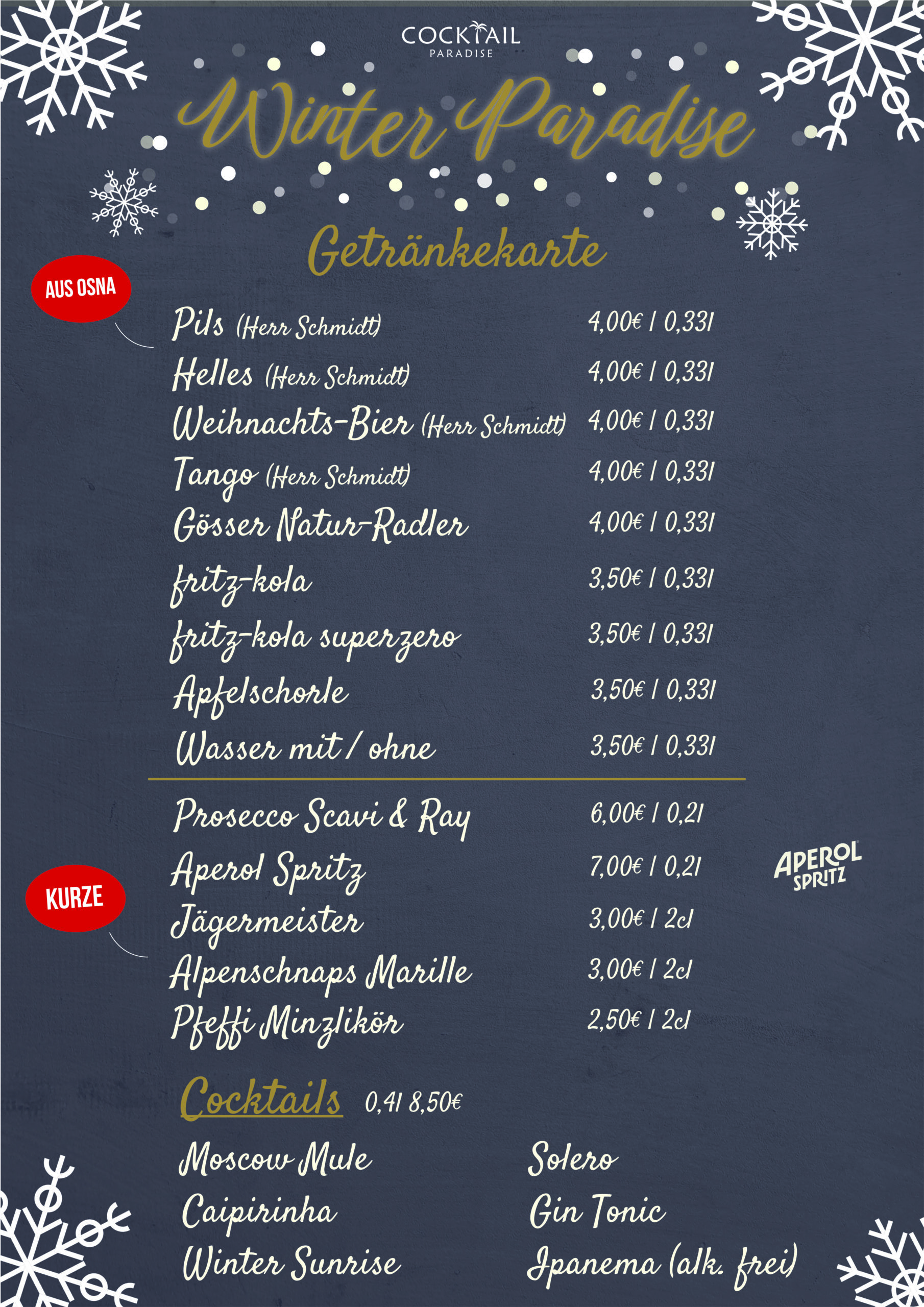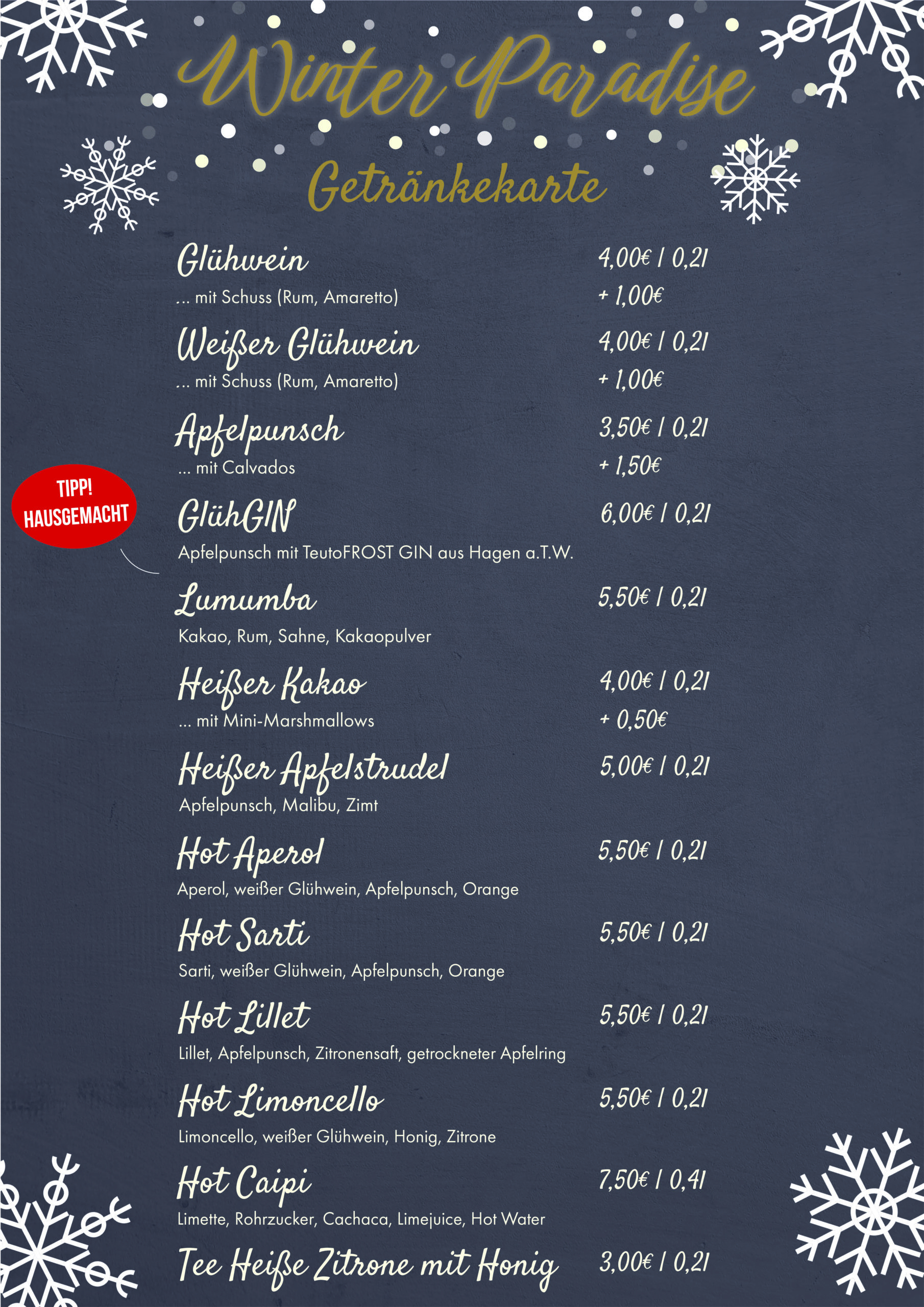 Diverse Crêpes-Varianten stehen Euch 5 Wochen lang zur Auswahl. Ob klassisch mit Zimt & Zucker, Nutella oder doch lieber herzhaft mit Käse & Schinken – Ihr habt die Wahl. Außerdem gibt es warmen Milchreis mit Zimt & Zucker. Lasst es Euch schmecken